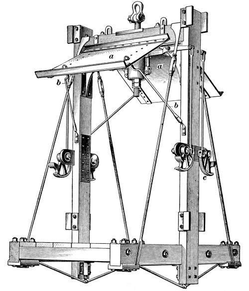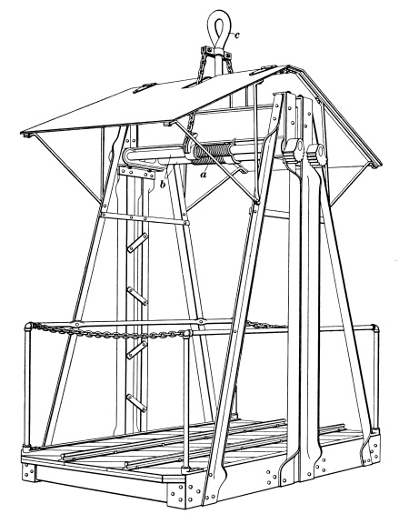 Fig. 12 shows a cage for use in a slope or steeply inclined shaft. It is made of steel with timber platform and differs from a vertical shaft cage mainly in having its upper frame inclined and in running on four [Pg 15] wheels a, b. These wheels usually run on timber guides, so that the safety dogs c will take hold of the guide in case the rope breaks. For slopes of variable inclination, the platform d may be made adjustable by means of a hand lever so as to be always level.