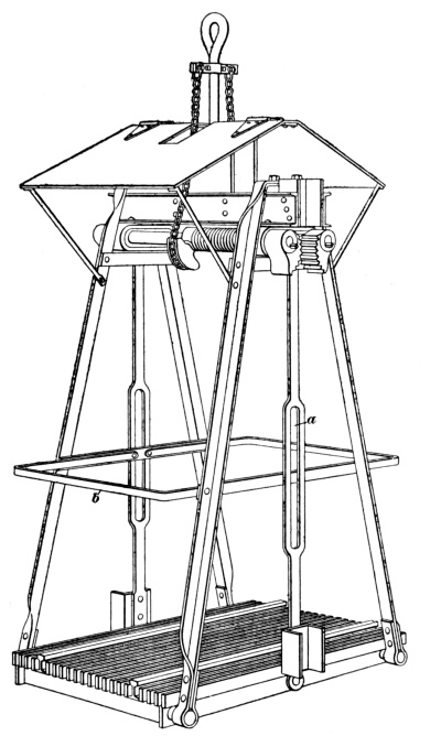 12. The Light Steel Cage.—Fig. 9 shows a light steel cage much used at gold and silver mines. It has a spring drawbar and steel safety dogs, operated by steel springs, as in Fig. 8, but the floor is of steel grating in order to give as little air pressure as possible against the cage. The openings a in the side frames are provided so that through them the nuts can be tightened on the bolts that hold the shaft guides. The cage is provided with bails b that swing down over each end of a car to hold it on the cage.