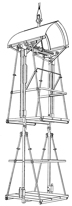 24. In order to take the strain off the hoisting rope while a cage or skip is being loaded or unloaded, a mechanism to support the cage is placed at the top and at any level of the mine where loading is done, excepting at the bottom level where all that is usually required are the cross-timbers for the cage to rest on. These supports have different names in various localities, being known as fans, keeps, cage rests, landing dogs, landing chairs, wings, etc. Their use increases the safety of caging.