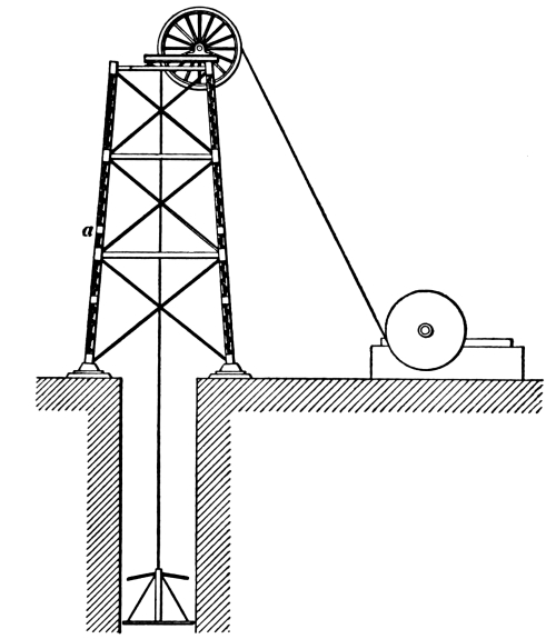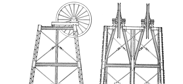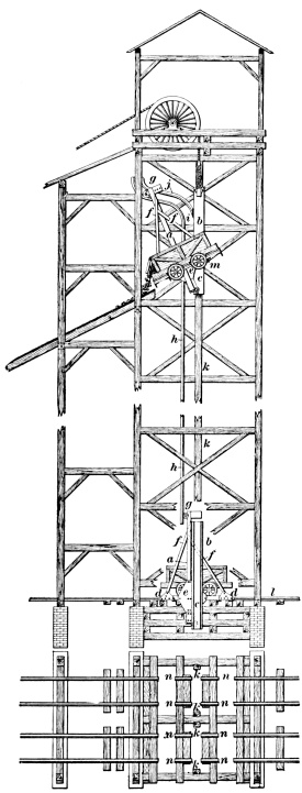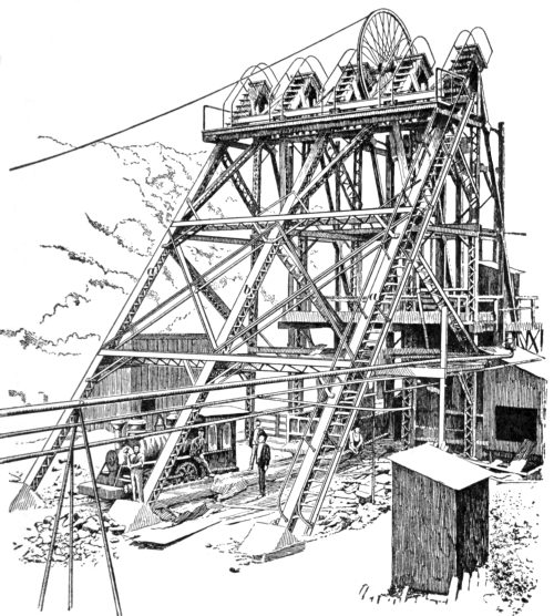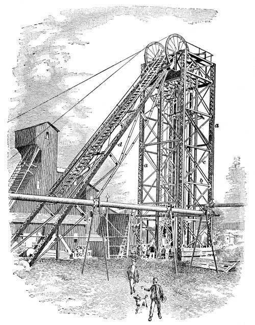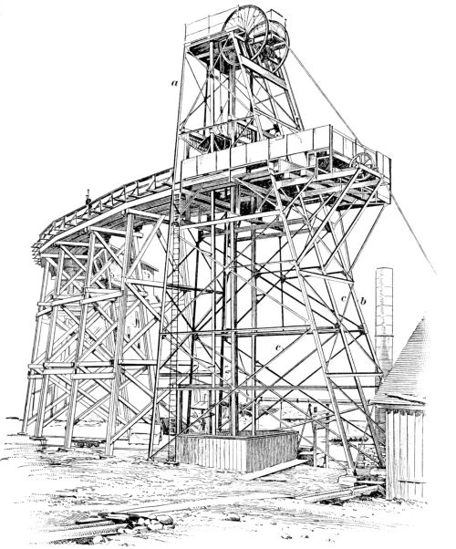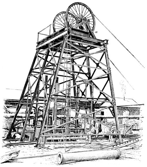 29. A head-frame of wood, iron, or steel is built over a shaft or slope mouth to carry the sheaves over which the hoisting ropes are conducted from the mine to the drum of the hoisting engine; it also usually carries the upper portion of the cage guides or, in the case of a slope, the tracks for cars. [Pg 30]