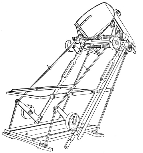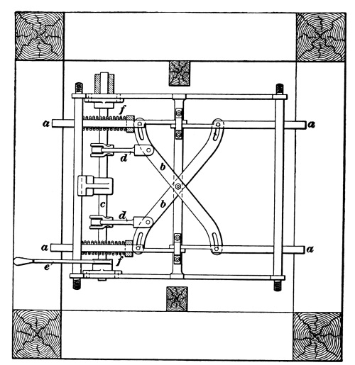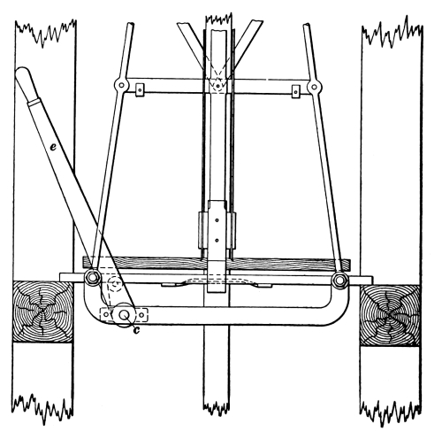 28. Cage Chairs.—In the case of a cage required to stop at a large number of levels, it is expensive to provide fans at each level, and to obviate this a strong steel bar or dog may be used under each corner of the cage, all four bars being connected to a lever on the cage, by means of which they can be thrown out at will so as to rest on supports provided at each level. Fig. 27 shows Gray’s patent cage chair, which operates on this principle. The sliding bars a are connected by the cross-bars b, which are pivoted at the center and operated by the bar c through the links d. By moving the lever e into the position shown, the bars a are thrown out so as to rest in notches or on wall plates in the shaft. The springs f, through the cross-bars b, force the sliding bars a back under the cage when the lever e is released.