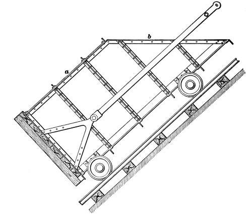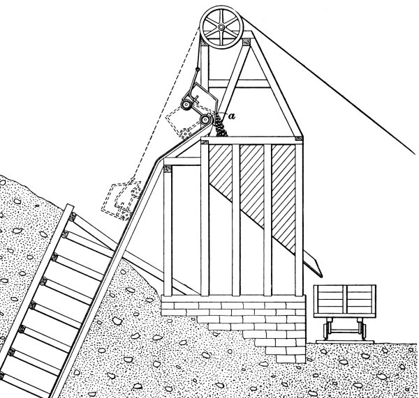 If the material comes to the slope as shown in Fig. 17, it is necessary to let down a bridge a, on which the car runs, in order to reach the skip. After the car is dumped, the bridge is lifted out of the way into the dotted position, so as to leave the slope unobstructed.