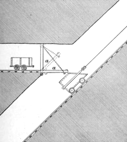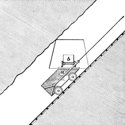 These carriages are sometimes built to run on a slope track of the same gauge as the mine cars, but to insure stability they have generally a broader gauge. The headroom necessary is governed not so much by the form of the carriage as by the length of the car and the inclination of the seam. This height is less when the cars are placed on the carriage with their length across the slope than when they are run on lengthwise; but this arrangement increases the width of the slope. When the inclination is very steep, the wheels are sometimes placed on the sides of the carriage and above its center of gravity and run between two tracks or guides, on each side of the slope.