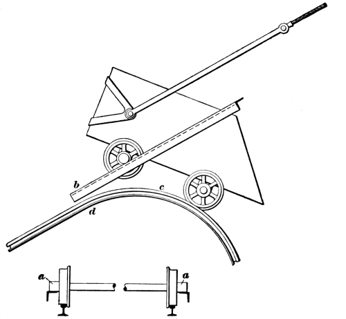 [Pg 23] In the method illustrated in Fig. 20, the rear and front wheels have the same tread, but the rear axle is longer than the front and has rollers a on each side. These strike the track b, and while the front wheels follow the curved track c these rollers run on the track b and thus raise the rear end of the skip.