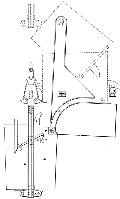 20. Skip Cage.—Where a self-dumping skip is to be used in a vertical or highly inclined shaft and it is desired to use safety catches, the skip a is mounted in a cage or frame b, Fig. 21, similar to the self-dumping cage, Fig. 11. The skip being pivoted at c one side of the center, and resting on the frame of the cage, tends to remain upright until it reaches the dump; but for safety it is sometimes locked in place by the latch d, which hooks over the pin e. When near the top, the roller f on the end of the latch d comes in contact with a bar that depresses the roller and thus unhooks the latch. The roller g enters and travels along the guide rails h, tipping the skip. There are two rollers g, one on either side of the skip. The nose i is temporarily caught on the roller j, thus stopping the movement of the skip sidewise and away from the upright guide.