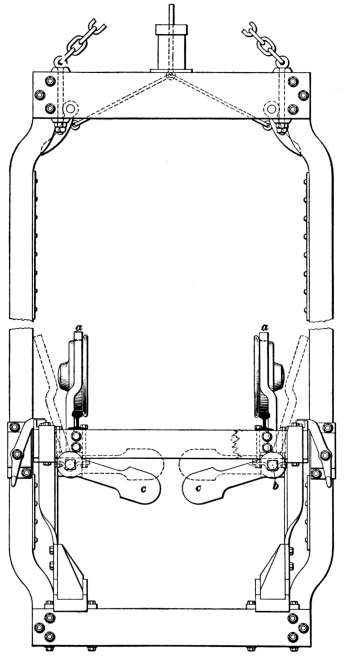 11. The Heavy Steel Cage.—The cage that is shown in Fig. 8 is made of iron and steel except the wood flooring, which is laid in two courses, one lengthwise and one diagonal. The joints should not be driven too tightly, as the wood is likely to swell. The track is bolted to the floor, or deck, of the cage. The cast-steel safety dogs are operated by steel springs a, coiled about the bars b, [Pg 11] which are connected to the drawbar c by chains, as shown. The drawbar drops if the rope breaks and thus assists the action of the springs a. This cage is in use at both coal and iron mines, and is built to suit any size of shaft and guides. Standard sizes are given in Table I.