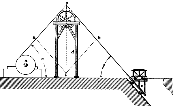 The amount and direction of stresses that a head-frame must resist are usually determined by applying the parallelogram of forces as follows: Fig. 28 is a simple head-frame at a slope; a is the drum of the hoisting engine with the rope coming from its upper side and running over the head-sheave b down to the slope cage c. Assuming that the angles e, f made by the two portions of the rope with the horizontal are equal, and that the pull on each part of the rope is 20,000 pounds, to determine the amount and direction of the resultant of the two rope pulls, proceed as follows: Extend the rope lines to the point of intersection g and from there lay off the two lines g h and g k, to some definite scale, representing the pull of the rope. If a scale of 2,000 pounds to ⅒ inch is taken (⅒ inch = 2,000 pounds), g h and g k will each be [Pg 32] 1 inch long. Complete the parallelogram by drawing h l parallel to g k and k l parallel to g h. The diagonal g l represents the direction and amount of the force acting on the head-frame due to the pull of the two portions of the rope. The diagonal, by measurement, is 1½ inches or ¹⁵/₁₀ inches long, and since each tenth inch equals 2,000 pounds, the stress on the head-frame in the line of the diagonal g l is 2,000 × 15 = 30,000 pounds. The figure also shows that the direction of this force is vertical, hence there is no tendency for the frame to be pulled over to either side and, theoretically, side bracing is not needed.