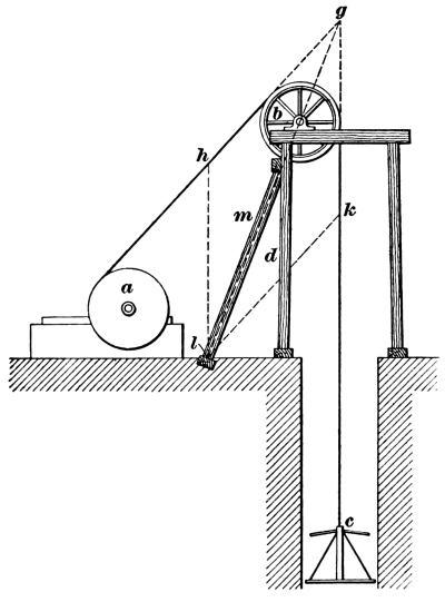 30. Consider now the case of a vertical shaft, Fig. 29, in which, as before, a is the drum, b the head-sheave, c the cage, and d the head-frame, and assume the same pull of 20,000 pounds on each part of the rope. As before, extend the lines of the rope, which are the lines of force along which the pulls due to the engine and the load act, until they intersect at g. From this point lay off on these lines distances representing the stresses in the rope to any scale. Using the same scale as before, ⅒ inch = 2,000 pounds, the lines g h and g k representing the two forces will be each 1 inch long. Completing the parallelogram by drawing h l parallel to g k, and k l parallel to g h, and drawing the diagonal g l through g, the resultant, g l = ¹⁹/₁₀ inches, represents a stress of 38,000 pounds. The direction of the resultant is also determined, being in the line of the diagonal g l. If the head-frame shown in Fig. 28 [Pg 33] were used for this case, it would be overturned by this resultant force, unless the leg on the opposite side of the shaft from the engine were securely anchored, so an inclined brace m is added to resist this overturning action. The resultant of all forces acting on the head-frame should generally fall within the structure if the greatest stability is to be secured, but when this cannot be done it is necessary to resist the overturning pull by anchoring the head-frame to its foundations much more securely than is the case where the resultant falls within the structure.