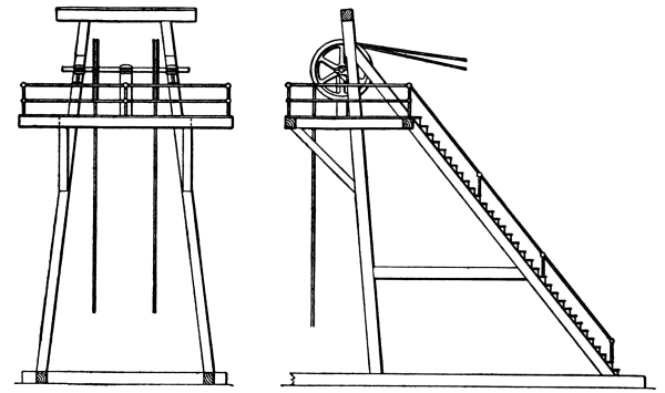 Fig. 33 shows the construction of the ordinary timber gallows frame used at many ore mines.