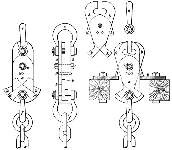 42. In hoisting, there is more or less danger of overwinding or lifting the cage too far, and dashing it against the top of the head-frame, or if the top is open the cage may be pulled entirely over the top. Detaching hooks are intended to prevent this. Several varieties of such hooks are made, which differ from each other only in their smaller details. In all of them, detachment is effected by passing the rope through a circular hole in an iron plate or through an iron cylinder, the diameter of which is sufficient to allow the upper portion of the hooks to pass through when passing upwards, but the lower portion is made larger and so arranged that when this larger part strikes the plate the upper portion is forced open and the hoisting rope released. After the upper part has been thus opened, it is too [Pg 47] large to pass back through the opening and the plate and the cage is therefore held suspended. Fig. 39 shows such a hook. It consists of two outside fixed plates slightly narrower at the top than the diameter of the hole in the disengaging plate h. Between the frame plates a are two inner plates b that move about a strong pin c passing through both plates a and b, but near the bottoms there are two projections d to prevent the hook from passing entirely through the hole. The winding rope is attached to the top shackle e and the cage to the lower shackle f. When the two movable plates b are closed as tightly as possible at the top about the pin of the shackle e, they are secured by a copper pin g. In case of overwinding, when the hook passes into the hole of the disengaging plate h, the two projections k on plates b are pressed inwards, shearing off the copper pin g and allowing the plates b to turn about the central bolt c, thus releasing the shackle e. The plates b are then in such a position that the projections l on them cannot pass down through the hole. The cage then hangs by the hooks from the disengaging plate, and the rope passes on. An objection raised against this hook is that, being constructed of plates, there is considerable surface in contact between the moving parts, and unless they are regularly taken apart and oiled, there is danger of their rusting firmly together.