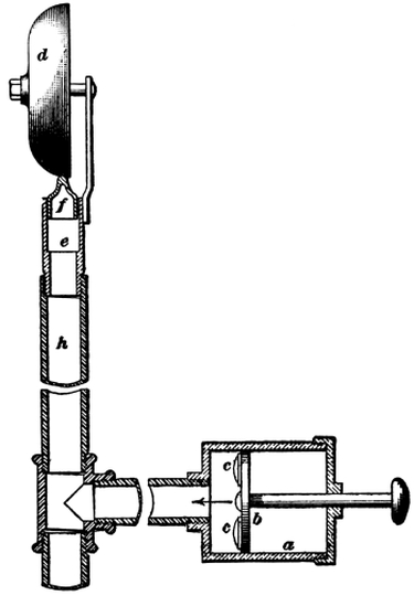 48. Pneumatic Gong Signal.—Fig. 42 shows an attachment that can be connected to a speaking tube and that is widely used for signaling. It consists of a brass cylinder a fitted with a piston b containing valves c. The gong d is attached to the cylinder e inside of which the clapper f fits loosely. When the piston is pushed inwards, as shown by the arrow, by means of the handle, the air in the cylinder and in the pipe h is compressed and forces the clapper f upwards against the gong d. The arrangement of these gongs in the mine is shown in Fig.43. A cylinder and whistle are usually placed at each landing [Pg 51] and a gong and whistle in the engine room, though, if desired, a cylinder, whistle, and gong may be placed at each landing and in the engine room.