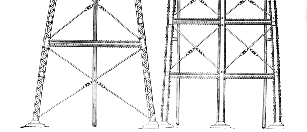 35. Square Type Without Inclined Brace.—Fig. 35 shows a steel frame in which the tendency to be overturned by the pull of the rope is resisted by a nearly vertical tension leg as explained in Art. 32. Each leg of the frame is built of channel bars connected by lattice bracing, as shown, and the legs are stiffened by horizontal channel cross-bars similarly braced and also by diagonal tie-rods, provided with turnbuckles.