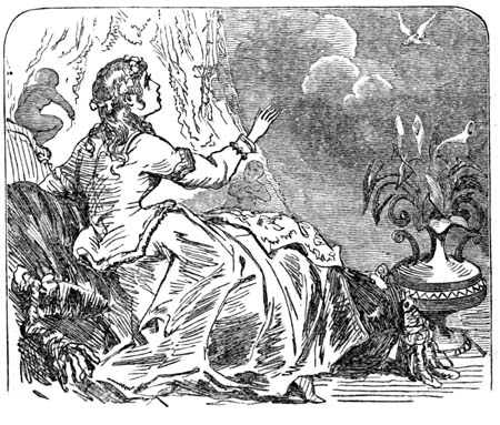 This is her private chamber. The windows are lofty, and more than half hidden by rich curtains of crimson. The walls are covered with cloth of crimson and gold. Vases of white lilies fill the air with their fragrance. How beautiful is the pale lady, reclining upon her dark cushions of velvet! Her robe is of blue silk, embroidered with silver. Her fair hair is adorned with a wreath of blue flowers. These flowers are made of precious[11] stones, and the leaves are of silver. Her eyes are blue, too, very blue,—bluer than her silk robe,—bluer than the flowers in her hair. And oh! if her cheeks had but looked rosy then, she would have been the most beautiful queen in the world. But her face was very, very pale; so that when she was not called the Queen, she was often called the Pale Lady, or the White Lady, and sometimes the Lily Queen.