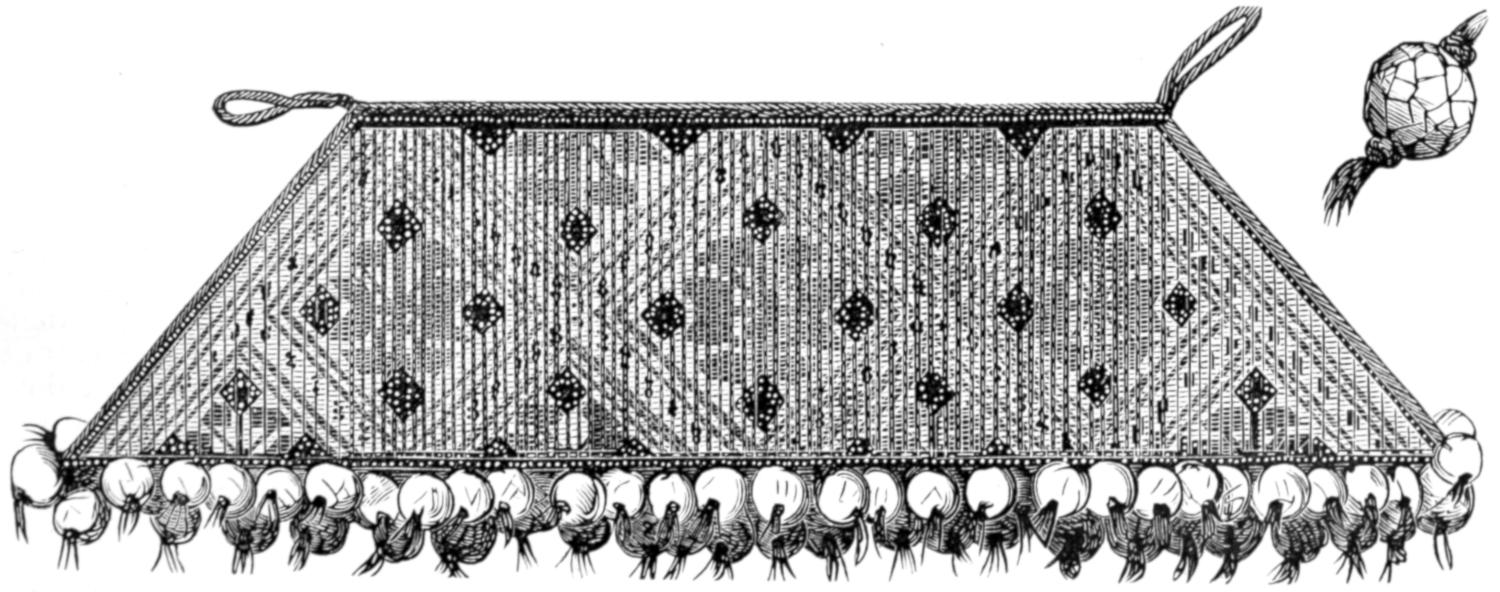 Though some of the more industrious of the men aid the women in their agricultural labor, yet it is characteristic of these hill men that they dislike work, and all the toil and drudgery are the lot of the women. The custom of the men is to wander from house to house and from village to village, to gossip and drink and smoke. Having no inventive talent, they do not work in metal, their dahs even, though they are the indispensable attendants of the Kakhyens, being made by the Shans of the Hotha Valley. Their artistic work does not exceed the simplest designs of tracery in straight lines and the rude figures of bird and animal.