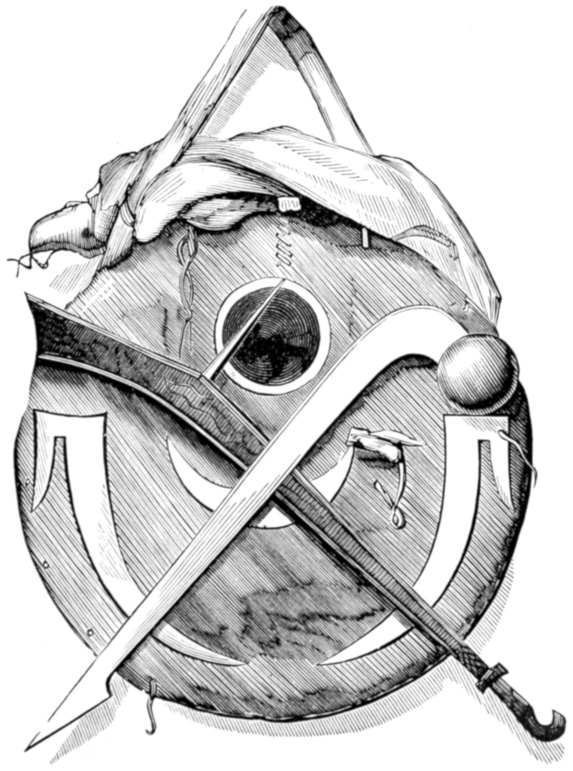 The dah, or knife, is the invariable companion of these Highlanders. “Half sheathed in wood and suspended to a rattan hoop covered with embroidered cloth and adorned by a leopard’s tooth, it is slung over the right shoulder so as to bring the hilt in front ready to the grasp of the right hand.” The most common style of knife is short and broad, widening from the hilt to the tip. This is called by the Burmese “the Kakhyen’s chief,” because of the dexterity with which it is handled by these mountaineers. It is the instrument for carving and tracing ornaments on pipes and other articles, as well as the weapon which is relied upon for attack or defence. With it the Kakhyen settles his dispute, and employs it with marvellous readiness against his visible enemies or the invisible nats or deities. They have other arms, such as the matchlock and a cross-bow, with poisoned arrows.