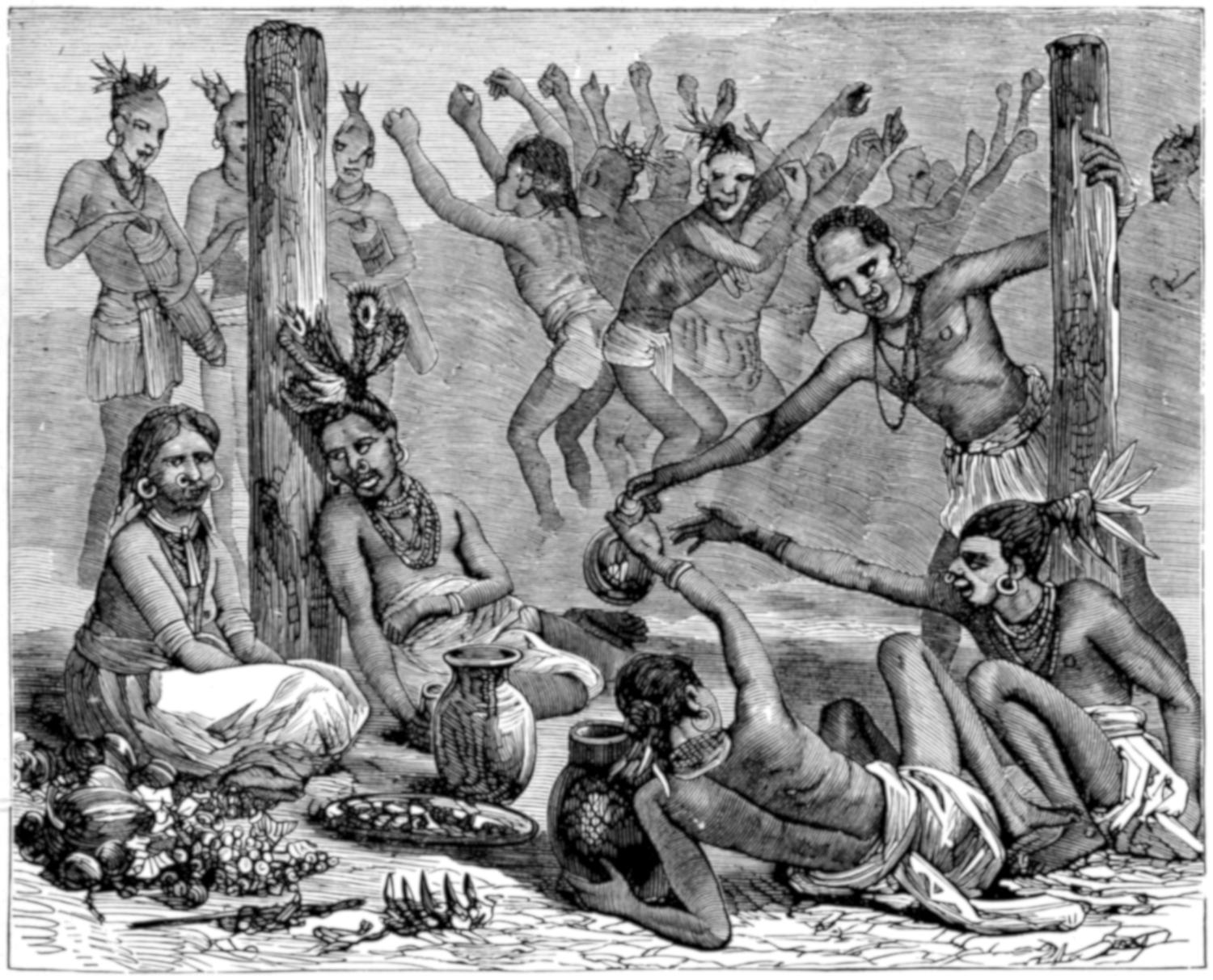 At every marriage there is an invocation to the household nats, and a libation of sheroo and water. The grass-path over which the bride passes from the canopy is sprinkled with the blood of fowls. Boiled eggs, ginger, and dried fish are offered to the household deities. This ends the ceremony. The bridegroom is merely a spectator of all these rites. Then a grand feast follows. In addition to the usual fare, such as plantains, rice, fish, and pork, the flesh of the buffalo, offered in sacrifice, and that of the barking deer are provided for the guests. These viands, together with liberal supplies of sheroo and the Chinese samshu, are the preparations for the dance. Various musical instruments are employed to contribute to the entertainment of the occasion; and the marriage feast ends at length, like all their festal gatherings, in drunkenness and often in a brutal quarrel.