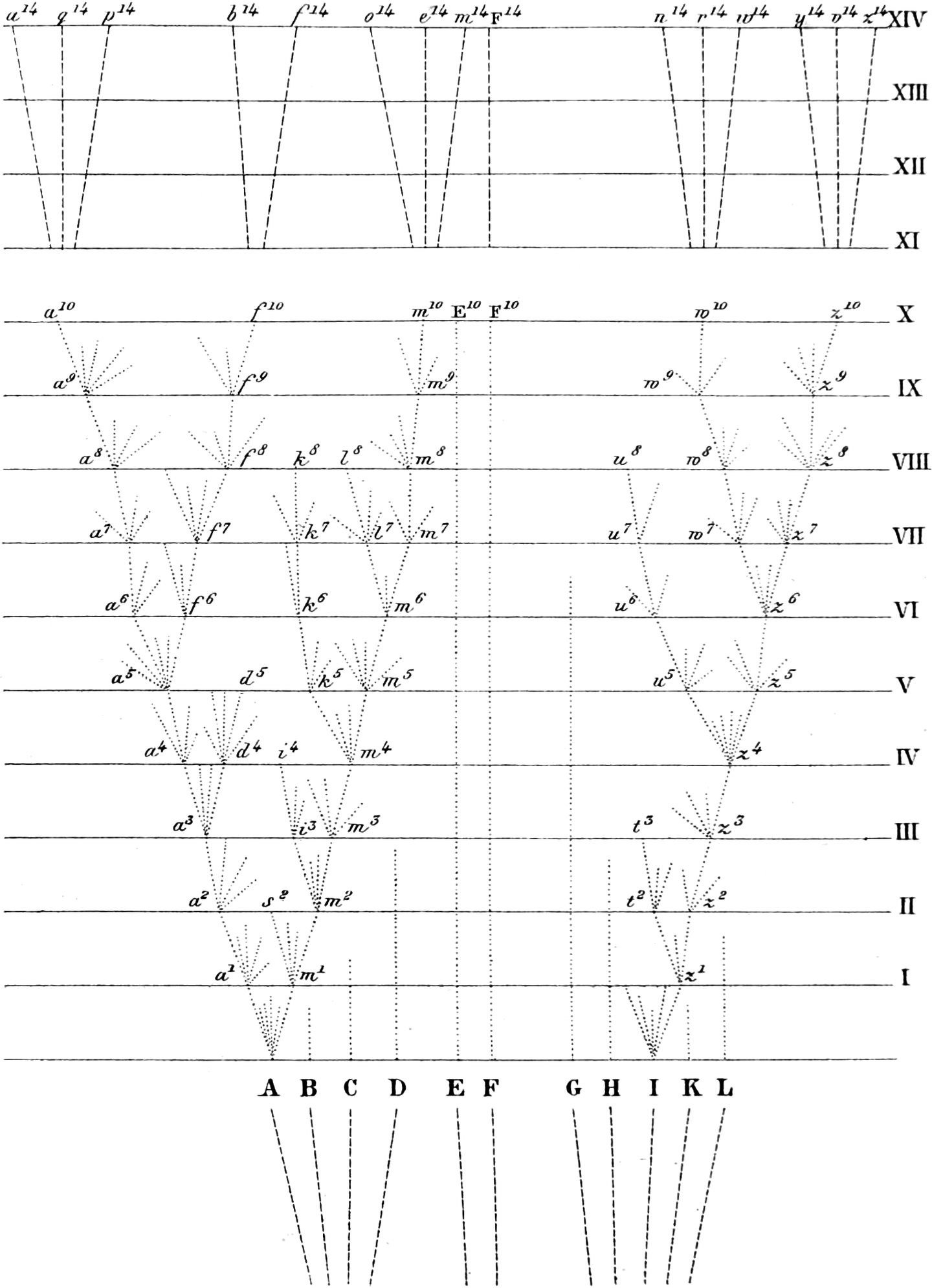 [34] Meine Meinung ist die, dass nur wenige Arten eine unsrer angenommenen Perioden überdauern, viele aber schon in 0,1–0,2–0,5 dieser Zeit zu Grunde gehen.