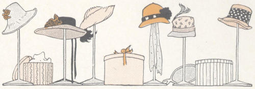 The milliner’s shop suggests the making of hats. Whether these be simple hats for a toy milliner’s shop, dolls’ hats of flowers of the season or other available material, or hats for Simple Simon, Colly-Molly-Puff, the Rabbit Woman, or any other character of the book, may be determined by the conditions when the study is made. The making of hats, caps, aprons, and other characteristic garments of the workers to be used in dramatic play provides another form of interesting and profitable work.