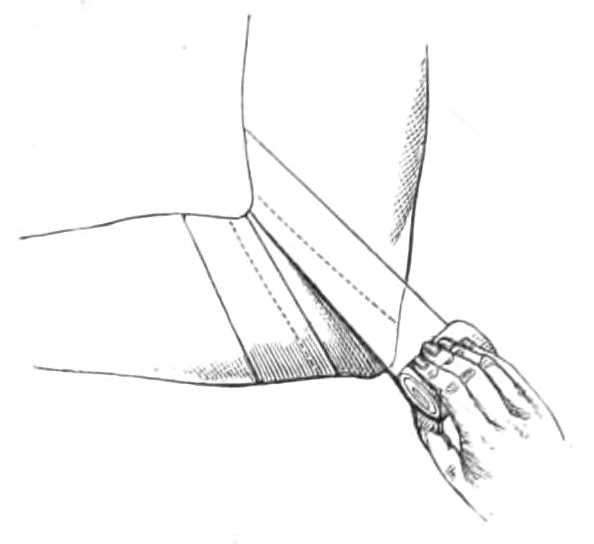General Rules.—Ordinary bandages are strips of unbleached calico 6 or 8 yards long, having a breadth of ¾ inch for the fingers and toes, 2¼ inches for the head and upper limb, 3 inches for the lower limb, and 6 inches for the body. These, when tightly rolled for use, are termed rollers. Besides these rollers for general use there are special bandages, such as rollers of muslin for using with plaster of paris, of stocking-webbing when elasticity is needed; four- and many-tailed bandages for particular fractures, &c. Messrs. J. & J. Cash, the cambric frilling makers of Coventry, now make a very firm light bandage of unbleached cambric woven in the necessary widths and lengths for use; these are very cool and pleasant, and a decided improvement on the ordinary calico strips generally used.