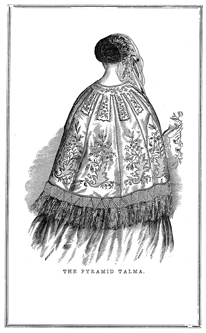 THE Talma we select for illustration is peculiarly becoming, especially for the richest toilet. Its material is white poult de soie. It is constructed of nine pieces cut in gores or pyramidal form, joined together, the seams being hidden by a fancy braid trimming. Nine tabs, widening at the bottom, and placed at distances equal to their width, descending about one-third of the depth of the garment, constitute the form of this novel garment. It is exquisitely adorned in needlework, and beautified by an elegant netted fringe. By an oversight in the drawing, fringe, which should also border the tabs that form the upper portion of the dress, was omitted.