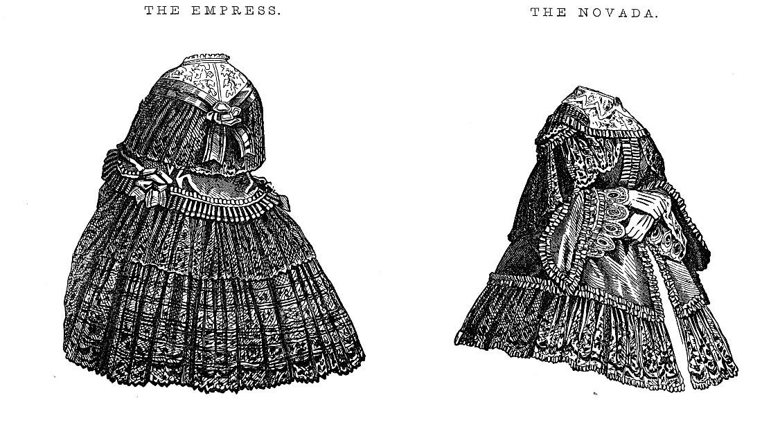 THE EMPRESS.—A silk mantelet, cut low in the neck. Two hollow plaits forming a fichu are trimmed with a bow in the middle of the back. The bottom is bordered by a wide ribbon plaited with bows at each side of the arm. Two rows of lace complete it.