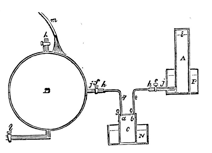 In 1842, M. Appert's method was made the subject of a further patent, granted to Mr. Bevan, whose process consisted in expelling air from the cases containing the food, by placing such cases in connection with a vacuum chamber, or other exhausting apparatus, and also with a vessel containing gelatine or other suitable fluid material, in such a manner that, by opening the communications, the air escapes into the exhausting apparatus and the gelatine takes its place. By this method the high temperature previously used in preserving food was not required; it could, on the contrary, be cooked at very low temperatures, and in a space almost void of air. The apparatus used is shown in section, in the following figure: A is a vessel open at the top, and filled to the line i with fluid gelatine, having a pipe j, and a stopcock e firmly attached to it. B is a sphere of metal in which a vacuum is produced by blowing steam through it by the pipe l out through k; l and k are then closed, and a jet of water at m, applied to the outside of the sphere, condenses the steam and leaves a vacuum within it. The substance to[Pg 492] be preserved is inclosed within a cylindrical tin vessel C, the top of which is then soldered on, and two small metal pipes d and c passed into it air-tight, as far as a b; the other ends being secure to the pipes j j at h h. The case is next immersed in a water-bath N, at a temperature of about 120°, and by turning the cock f, the greater portion of the air in the case C rushes into B; the article of food, animal or vegetable, in the case, being thus relieved of atmospheric pressure, the heat of 120° is sufficient to cook it, and to expel the air from it. A fowl is cooked in this way in about fifteen minutes. The cock e is then opened, and the gelatine, kept fluid by the warm bath P, enters by the pipes j and c, into the case C, and drives the small portion of air left therein into the vacuum chamber B. The case C is then hermetically sealed by nipping the tubes d and c at the points g g. The case is then submitted for a few minutes to the action of boiling water (thirty minutes for a fowl), and when cool, the process is complete.