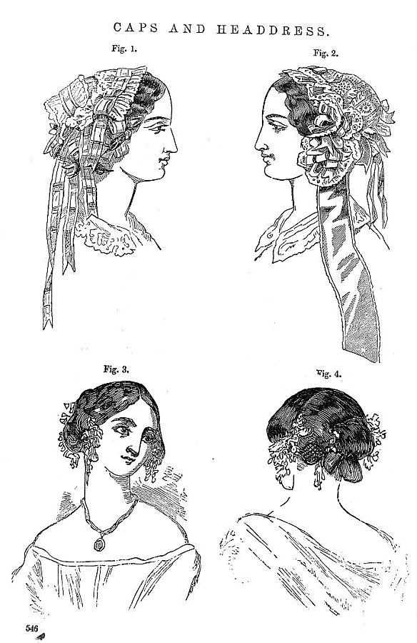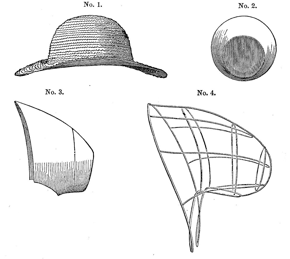Leghorn bonnets are still worn, though in July and August more dress hats of silk, crape, and lace will be seen. The Leghorns are in unusually good shapes, and trimmed very simply, either with straw, marabout plumes, or plain white ribbons. We speak of the prevailing styles; of course, many tastes are to be suited, and some people would flounce a moir antique with the same, if they thought it would look more expensive, and for this class of community ribbons and garlands cannot be too profuse even on a Leghorn, which, if handsome, is generally considered, like a rich silk, to "have no need of ornament." There is a profusion of plain straws of every shape and cost. We notice that they come close, or nearly so, under the chin, and the whole bonnet is a gradual slope from the brim to the crown. They are trimmed in every variety of style, ruches of narrow ribbon box-plaited on, numerous flat bows of ribbon an inch in width disposed as a wreath, etc. etc. Ribbons, as a general thing, are much narrower than the past season, and those long scarf-like strings are not considered in good taste. We have before spoken of the profusion of trimming inside the brim. Blonde caps—a narrow edge of blonde usually sewn upon a broad or wash-blonde lace—are usually almost invariably used to soften the effect of the flowers and ribbon bows that encircle the face. The flowers used are of the most delicate description, made of crape, in strict imitation of nature. Flag flowers, convolvulus, lilac sprays, field violets, and all the more delicate blossoms, are exquisitely reproduced.