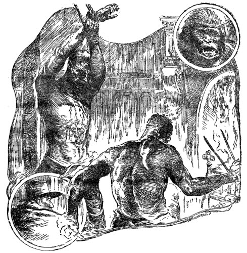 On it came, and his confidence waned. Bullet after bullet he sent crashing into its vitals, but it did not halt. Now he dashed the empty gun full into the gargoyle face without effect, and with a lurch and a roll it had him in its grasp. As the giant arms closed crushingly about him, he abandoned all hope, but following his fighting instinct to the last, he drove his dagger hilt-deep in the shaggy belly.