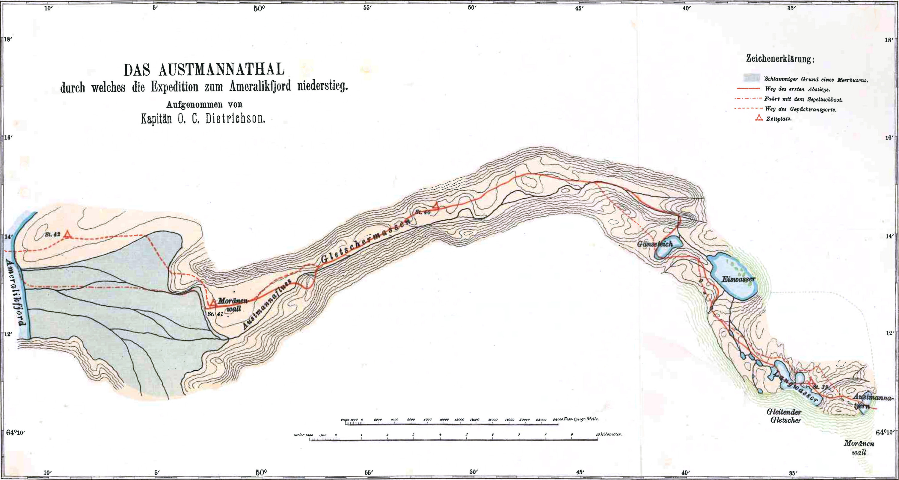 Pearys Angaben in Bezug auf Entfernungen und Höhen sind leider mangelhaft; so weit man aber nach seinen und Maigaards Berichten schließen kann, scheint die Steigung während des größten Theils ihrer Wanderung (sie wurde ungefähr auf dem 69½° Nördl. Br. unternommen) merkwürdig genau mit der Zirkelperipherie zusammenzufallen,[S. 435] welche von Nordenskjölds Expedition angegeben wird. Während der ersten 40 km der Wanderung ist indessen die Steigung bedeutend steiler als die Zirkelperipherie; dies kann aber seinen Grund darin haben, daß sie an einem Arm der Disko-Bucht aufstiegen, der tief in das Inlandseis einschneidet, so daß der Anfang ihrer Wanderung dessen Herzen bedeutend näher lag als der Ort, von dem Nordenskjöld seine Expedition antrat.