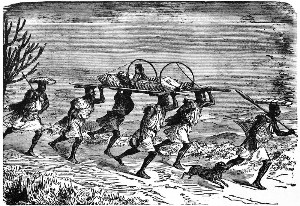 For instance he was carried many miles in a sort of portable lounge which was borne on the heads of four negroes. The Colonel lay at ease on this elevated conveyance, which had a little fence on each side to keep him from rolling off, and hoops so arranged that when it rained or the sun shone too brightly, a canopy might be thrown over him without interfering with his comfort.