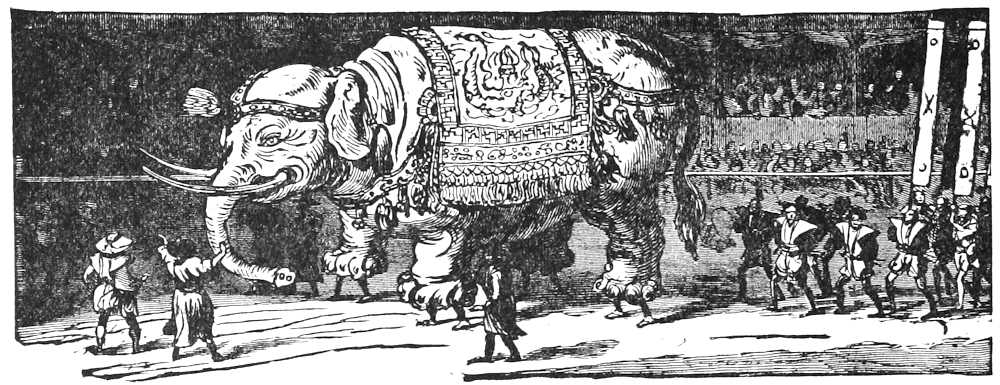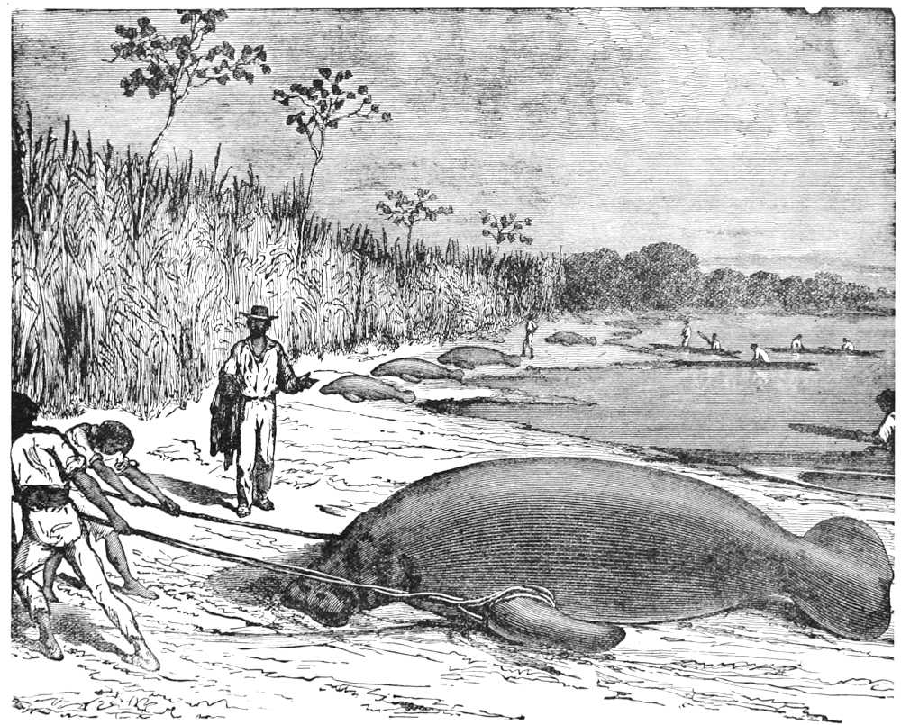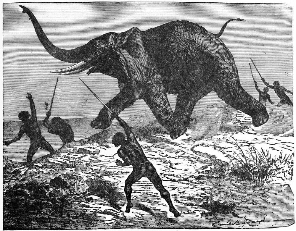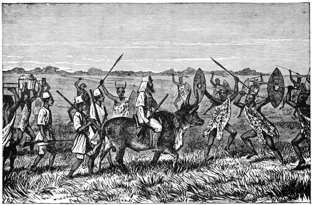 Another time, accompanied by a number of negro soldiers, and preceded by a set of fantastic savages who danced before him with horns on their heads and shields and spears in their hands, he rode for many miles upon a well trained native bull.