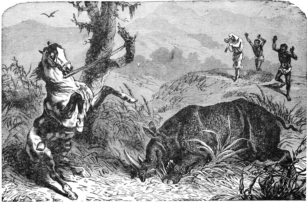 When they arrived on the scene, the rhinoceros was quite near the horse, who was rearing and pitching with terror, and pulling furiously at his bridle. The rhinoceros had his head down and his long sharp horn seemed to be almost under the poor horse.
