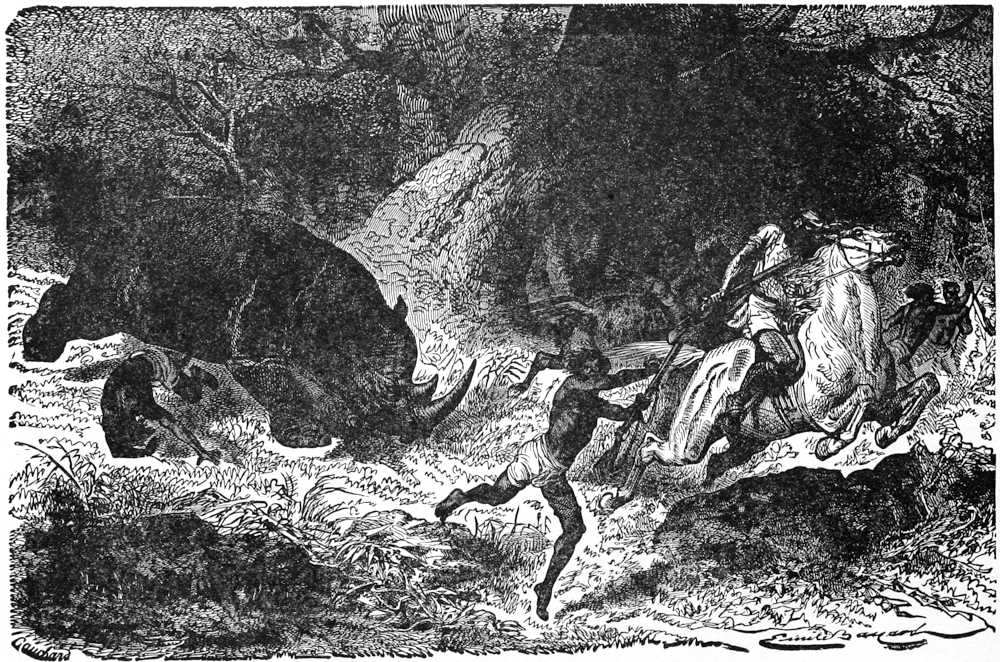 He had heard that there were rhinoceroses to be found in a certain hilly part of the country, and, accompanied by two negroes, he started on his horse quite early in the morning.