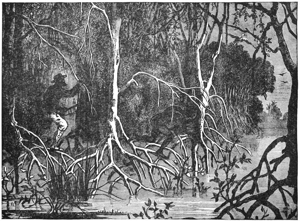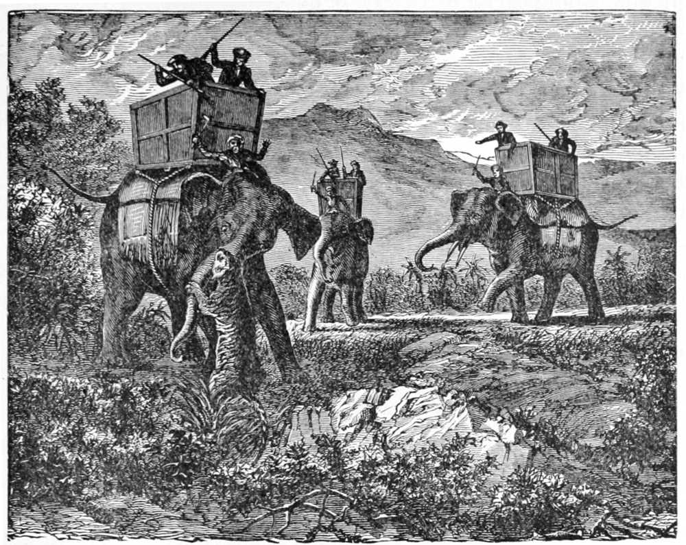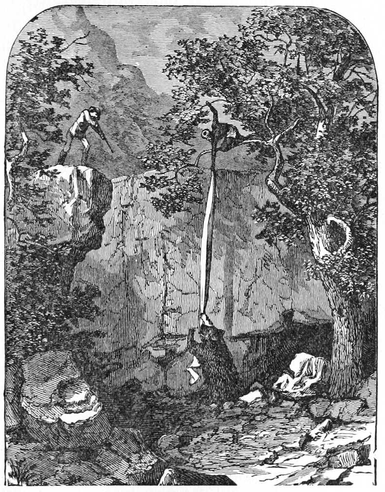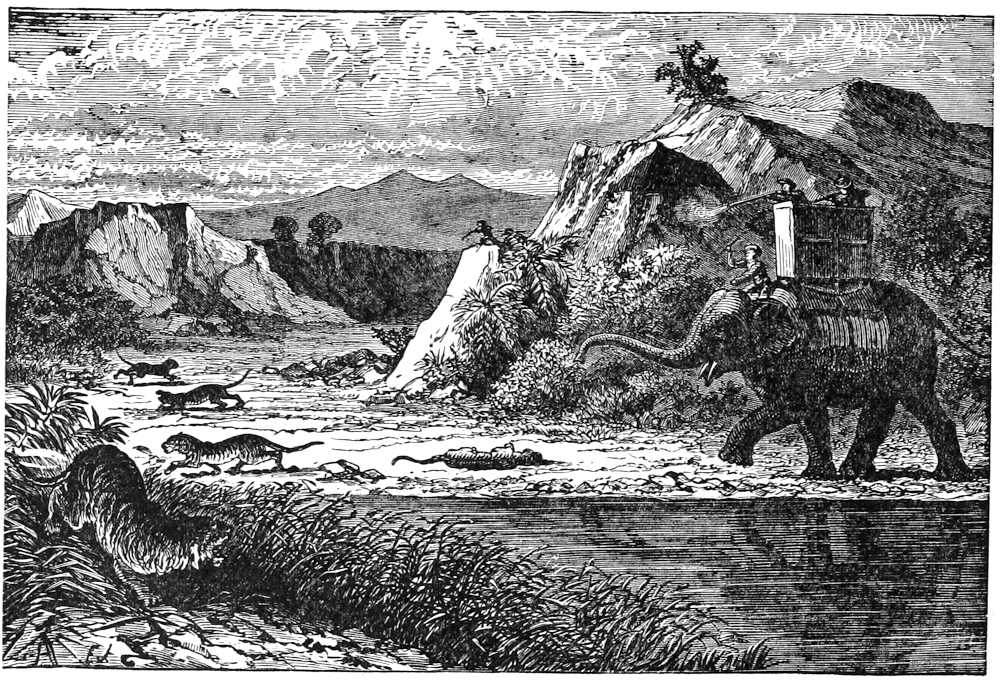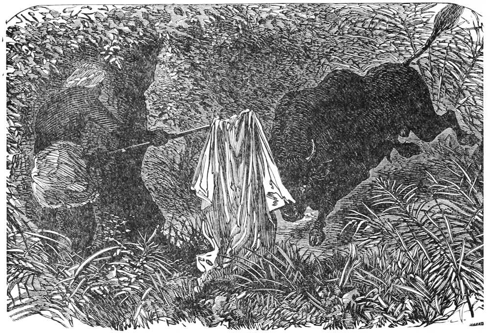 Reaching some very rough ground, he thought it better to climb over the rocks on foot, so he tied his horse to the branch of a tree and set off with his companions to reconnoitre. They walked up and down through the bushes, and over gullies, searching for the big animals they were after, but not a horn of one of them could they see.