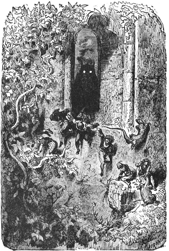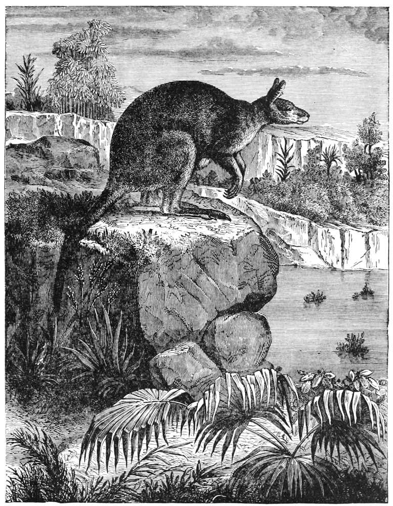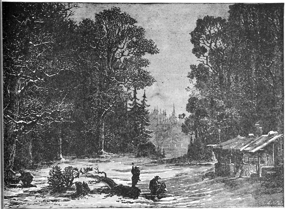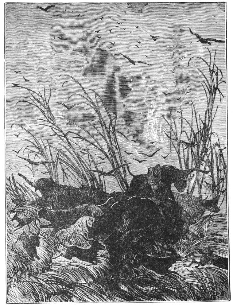 Reaching some very rough ground, he thought it better to climb over the rocks on foot, so he tied his horse to the branch of a tree and set off with his companions to reconnoitre. They walked up and down through the bushes, and over gullies, searching for the big animals they were after, but not a horn of one of them could they see.