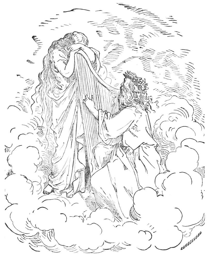 Quickly she seized her harp, and played the liveliest, merriest music that the fairies know. The notes seemed to be dancing, and jumping, and rolling and tumbling over each other in great glee, and yet it was true music, and perfect harmony. So penetrating and so stirring was it that it reached Carl’s benumbed senses. He opened his eyes,[Pg 307] and seeing a beautiful lady in white robes, holding a golden harp, and playing this lovely music, no wonder he thought he was in heaven.