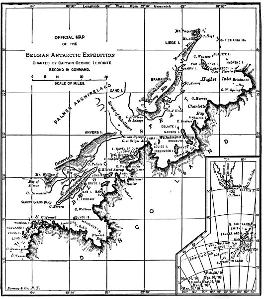 The work of the first three weeks in the new regions proved the discovery of a highway perfectly[xii] free for navigation during the summer months from Bransfield Strait, two hundred miles south-westerly, through an unknown land to the Pacific. This highway has received the name of our ship. To the east of Belgica Strait we discovered a high, continuous country which probably connects with the land charted as Grahamland. This has been christened Dancoland, in memory of our companion, Lieutenant Danco, who died on the ship during the long drift in the pack-ice. The land to the west of the strait is cut up into islands by several channels, and is named Palmer Archipelago, in honour of Captain Nathaniel Palmer, the American sealer who was the first of all men to see the outer fringe of this land. Scattered about in the waters of Belgica Strait are about one hundred islands and several groups of islands. About fifty of these are of considerable size. The islands, the capes, the bays, the headlands, and the mountains have mostly received the names of Belgian friends of the expedition; but prominent outside workers have not been forgotten, as is evidenced by Nansen Island and Neumayer Channel. Each officer was given the privilege of bestowing some names. Hence two islands which fell to my lot are named after the city of my home and the first mayor of Greater New York—Brooklyn and Van Wyck Islands.