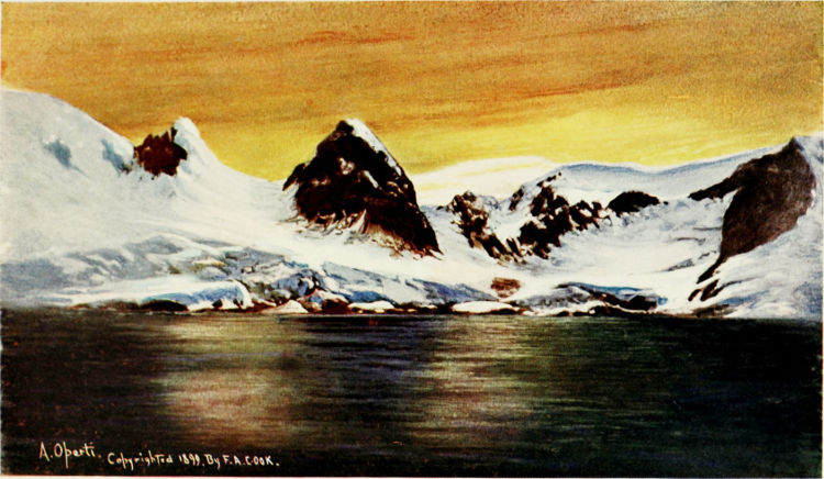 The Belgica left Antwerp at the end of August, 1897. She steamed and sailed down the Atlantic to Madeira, then across to Rio de Janeiro, down to Montevideo, and into the Strait of Magellan to Punta Arenas. After spending some time in the Fuegian channels and among the Cape Horn Indian tribes, we took our departure from the known world, at Staten Island on January 13, 1898. We sighted the South Shetland Islands a week later, where, during a violent tempest, we lost by an accidental fall overboard, the young and faithful Norwegian sailor, Wiencke. We next crossed the ever-foggy and ever-tempestuous waters of Bransfield Strait, and on the afternoon of January 23, 1898, came in sight of the outer fringe of a new land, the Palmer Archipelago. Entering this, we discovered a new highway, which in size compares favourably with Magellan Strait. To the east and west of this strait, we charted about five hundred miles of a land which had never before been seen by human eyes—part of a great continental mass which probably surrounds the south pole. It is buried even in midsummer under a ponderous weight of perennial ice. Passing out of the strait, we entered the South Pacific, and after skirting the western border of Grahamland to Adelaide Island and then to Alexander Island, we attempted to enter the main body of the pack-ice westward.