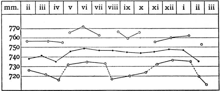 The interior south polar lands are likely to prove the coldest part of the earth. This is contrary to what might be expected, because the great circular sea which surrounds the entire globe should warm the comparatively small expanse of land. In the region of the Belgica’s drift, however, the indications were otherwise. Our position was in a restless sea of ice, far from land, with large open lanes of water constantly about us. It follows, then, that we should have had a mild marine climate. But our temperatures were persistently low, from -5° to -45° C., rarely above the freezing-point. And, following southerly winds, the mercury at once sank into the bulb. The suddenness and intensity of cold which came with interior winds bespeaks a very high and a very cold area. This question and a hundred others will be solved by meteorological studies. Problems of weather are associated with neighbouring phenomena. For the proper understanding of the climate of the southern hemisphere there is necessary a long-continued series of meteorological studies within the limits of perpetual ice.