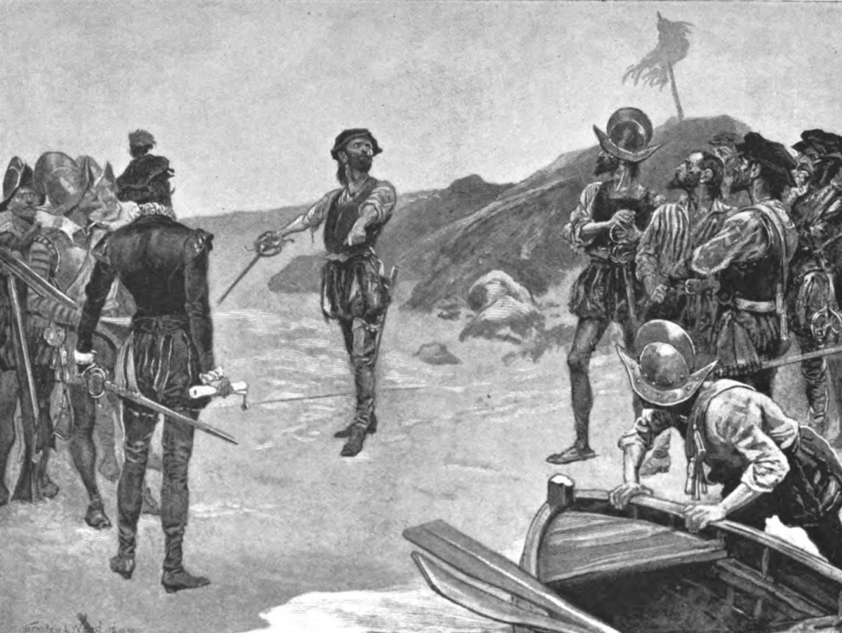 Surely thoughts like these were enough to shake the heart and turn back the steps of many a man who might well yield to such ill-fortune and yet still be accounted brave; but it was not such a man who stood beside the flagstaff-cairn on Gallo and stared out in defiance of Fate itself over that dreary sea and into those all-circling glooms. If he had been he would never have written the name of Francisco Pizarro in letters of blood and flame across the Western World beside that of Hernando Cortes, and, though he knew it not, ere that day’s gloom had deepened into the darker gloom of night, he was to show by a few brief words and one all-decisive act what manner of man he truly was.