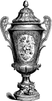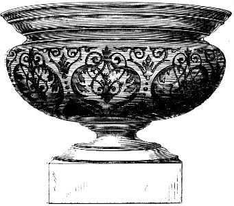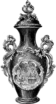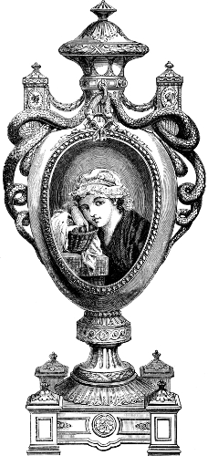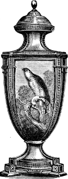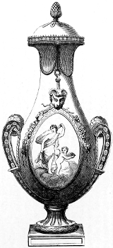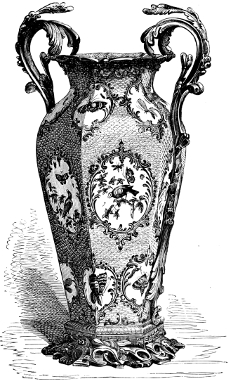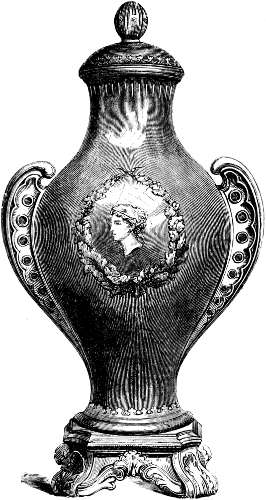 [83] It may not be out of place to allude to the Prince Consort’s unqualified approval and appreciation of these enamels. In 1854, Mr. Binns obtained permission to exhibit specimens of his new invention to his royal highness, whose commendations were most emphatically and unhesitatingly expressed, and he at once purchased all the examples which had been shown him, saying they were the best things he had seen. Her Majesty subsequently ordered some specimens of this work, which was all on dark blue ground; and latterly an order for a magnificent dessert service, in the same style of work, on a turquoise ground, has been ordered by her Majesty. The Worcester works owe much to the pure taste of his late Royal Highness the Prince Consort.