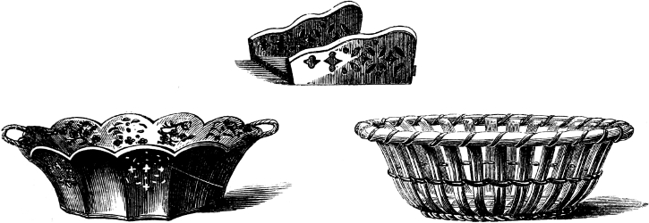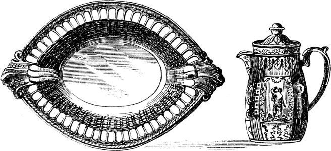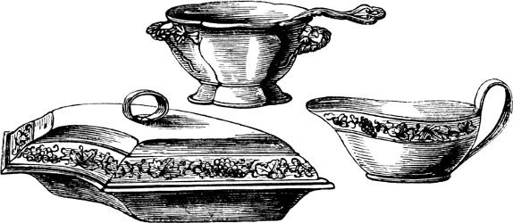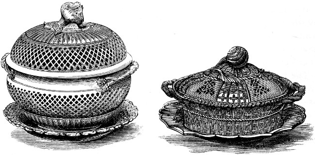 Nos. 1 to 4 are covered terrines; 5 to 8 are sauce terrines with spoons and stands; 9 and 10 are the same articles with fast stands; 11 to 13 are a pickle leaf, a sea shell, and an escallop shell; 14 to 17 are sauce-boats; 18 to 21 are oval dishes; 22 to 25, table plates; 26 to 29, covered, or ragout dishes; 30 to 34, sallads; 35, a turtle dish; 36 to 39, compotiers; 40 to 46, pierced dessert dishes, with open-work rims; 47 and 48, fish drainers; 49 to 54, salts, with covers; 55 to 57, egg-cups; 58 and 59, pierced double salts; 60 and 61, jugs; 62 and 63, salts; 64 to 67, mugs covered and uncovered; 68, melon terrine and spoon; 69, round terrine and stand; 70 and 71, covered bowls; 72 and 73, covered dessert, pierced covers, and bowls, &c.; 74 to 79, butter-tubs and stands; 80 to 82, single castors; 83 to 85, mustards; 86 and 87, strawberry dishes and stands; 88, platt menage; 89, water-bottle and basin; 90, ice cellar; 91 and 92, bakers; 93 and 94, ice-pails; 95, glass tray; 96 and 97, double and single pails; 98, hot-water dish; 99, asparagus shell; 100, escallop’d nappy; 101, salad; 102 and 103, large furnished castors; 104, oil and vinegar stand; 105 and 106, grand platts menage; 107 to 115, various candlesticks, some highly ornamental; 116, vase candlestick; 117, composite candlestick; 118, flat candlestick; 119 and 120, ewers and basins; 121 and 122, scaphia; 123 and 124, “spitting pots;” 125 and 126, shaving basin; 127 to 130, spoons and ladles; 131, pierced fish trowel; 132 to 136, fruit-baskets and stands of elegant basket, twig and open work; 137, pierced chesnut basket and stand; 138, ornamented jar, or pot pourri; 139, a cockle pot, or potpourri; 140, caper jar, or pot pourri; 141, covered flower cup; 142, a quintal flower-horn; 143 and 144, sweetmeat cups; 145, confectionery basket and stand; 146, a pot pourri, whose top inverts to form a candlestick; 147, inkstand; 148, a wafer-box; 149, a fountain inkstand; 150, a sand-box or pounce-box; 151, inkstand; 152, a cross with holy water cup. Tea ware: Nos. 1 to 4, teapots; 5 to 8, coffee-pots; 9 to 11, tea-cannisters; 12 and 13, milk pots with covers; 14 and 15, slop-bowls; 16 and 17, milk ewers; 18, tea or coffee-tray, with open-work border; 19 to 24, sugar-basins with covers; 25 to 32, cups and saucers of various kinds.