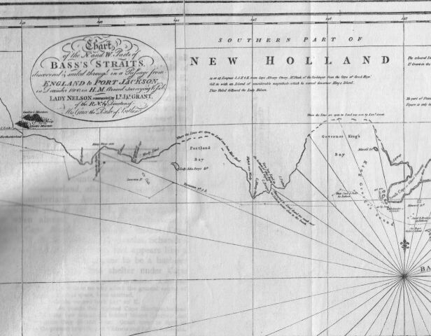 Drawn by Governor King. Writing of this chart, he says that the longitude in which Lieutenant Grant placed Cape Otway was about a degree and a half in error. He also made the land to trend away on the west side of Cape Otway to a deep bay, which he named Portland Bay. An examination of modern maps will show that the name Portland Bay has been retained for a bay to the westward of Grant's Portland Bay, which is now called Armstrong Bay.