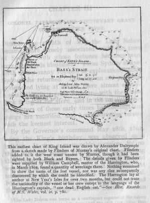 (CHART OF KING'S ISLAND IN BASS'S STRAIT. This earliest chart of King Island was drawn by Alexander Dalrymple from a sketch made by Flinders of Murray's original chart. Flinders added to it the west coast unseen by Murray, though it had been sighted by both Black and Buyers. The details given by Flinders were supplied by William Campbell, master of the Harrington, who, in March 1802, found a quantity of wreckage there. Nothing remained to show the name of the lost vessel, nor was any clue subsequently discovered by which she could be identified. The Harrington lay at anchor at New Year's Isles for over two months, but could not trace the nationality of the vessel or her crew except in the language of the Harrington's captain, "one dead English cat." See Historical Records of New South Wales volume 4 page 780.)