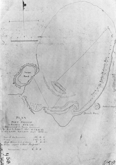 In this chart by Murray, sent to the Admiralty from Sydney by Governor King in 1802, few names appear, although Murray named Point Palmer, Point Paterson, and Point Nepean, and the fact that it bears the date January 1802 seems further evidence that it is the first chart of Port Philip drawn by its discoverer. It is one of those referred to as "unfortunately missing" in the Historical Records of New South Wales volume 4 page 764.