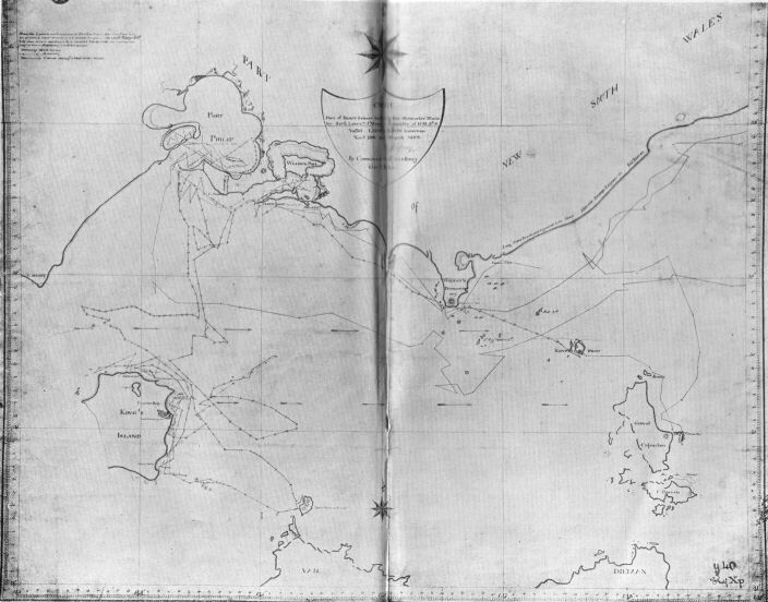 Drawn by Ensign Barrallier, New South Wales Corps, under the direction of Captain P.G. King, Governor of New South Wales." This chart is generally referred to as "Barrallier's Combined Chart." King doubtless alludes to it when writing to the Duke of Portland in May 1802. See Historical Records of New South Wales volume 4 page 761.)