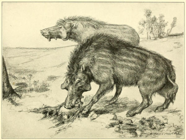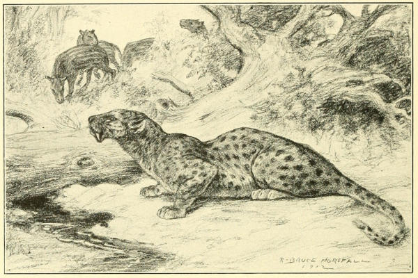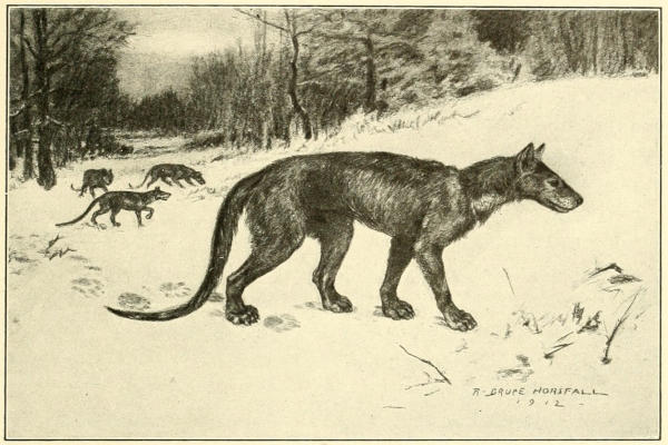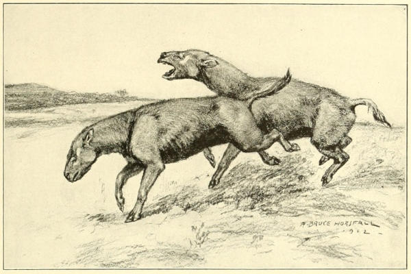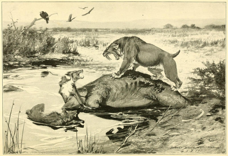 Frontispiece.—A Pleistocene tar-pool in southern California: †Giant Wolves (Canis †dirus) and †Sabre-tooth Tiger (†Smilodon californicus) on the carcass of an elephant (Elephas †columbi). The elephant is hairless, as may have been true of the southern race.