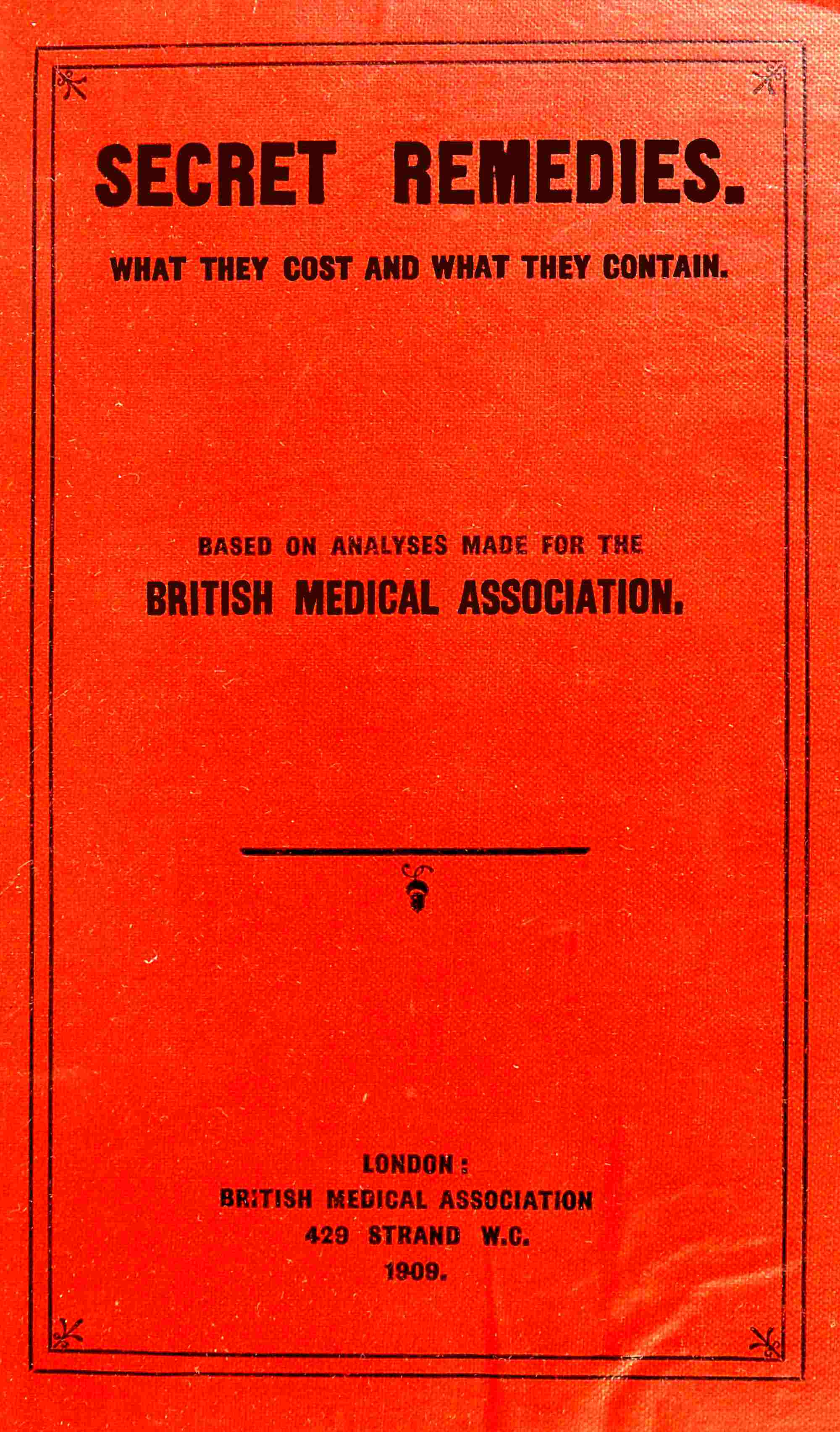 The British Medical Association considered, therefore, that it would be useful if not instructive to make analyses of some of the secret remedies, the virtues of which are so boldly advertised, especially in popular monthly magazines and weekly newspapers, and in diaries and almanacks pushed under the front door or dropped over the area railings. The results are given in the following pages; they have been classified under various heads, according to the particular kind of disorder for the cure of which the preparation is more particularly vaunted. The claims in some instances are so comprehensive that it has not always been easy to assign the nostrum its proper place, and for a few it has been necessary to institute a chapter on Cure Alls.