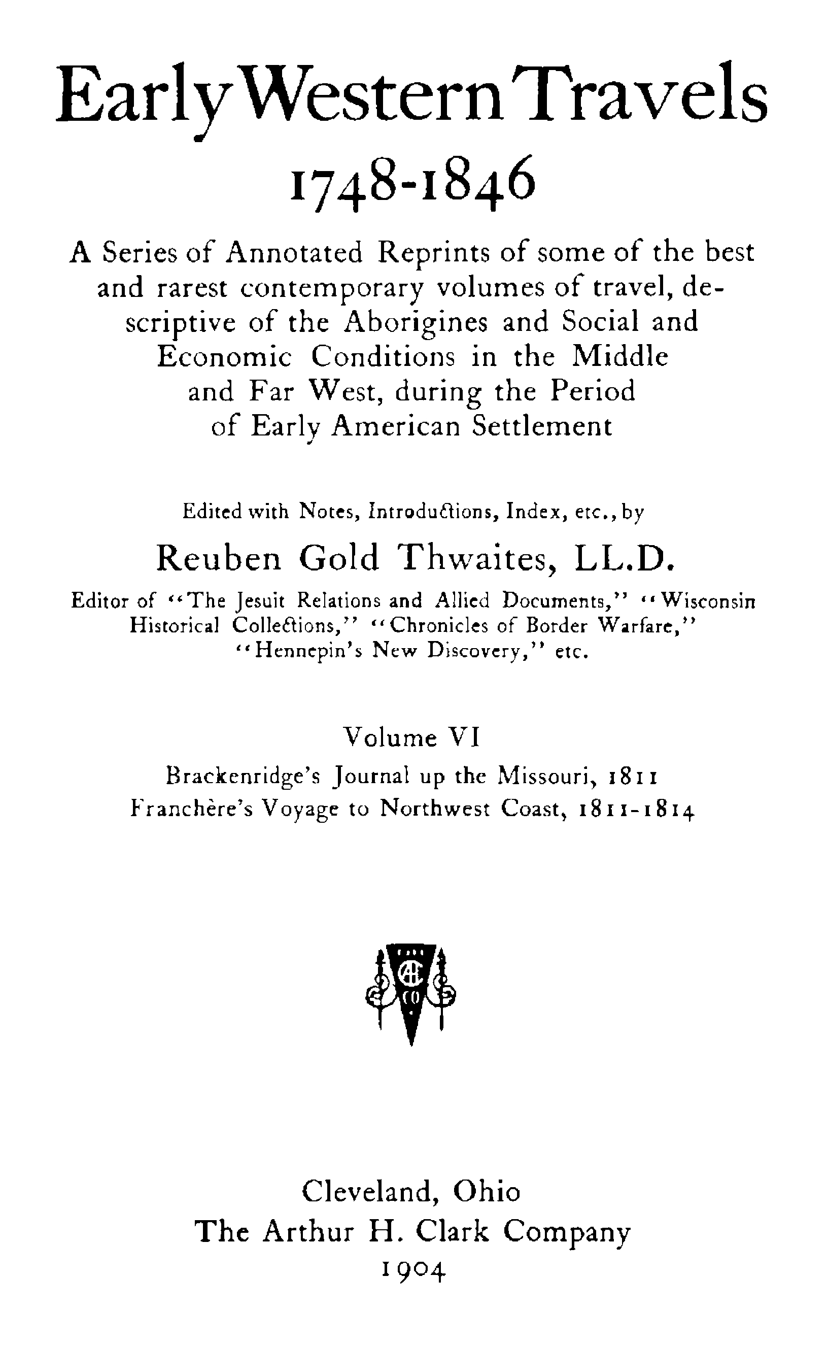 In this volume we present reprints both of Brackenridge’s Journal of a Voyage up the Missouri (1811), and of Franchère’s Voyage to the Northwest Coast of America (1811-14).