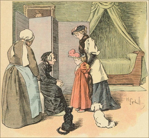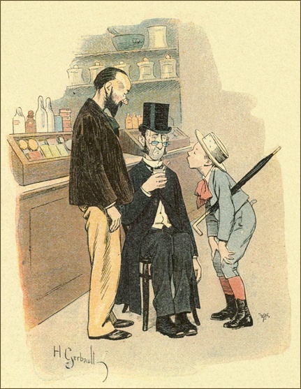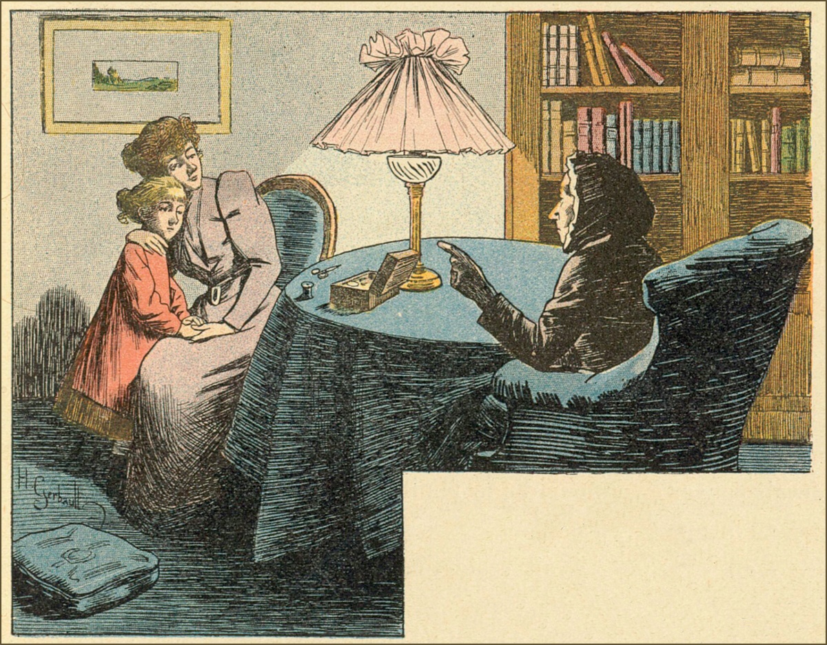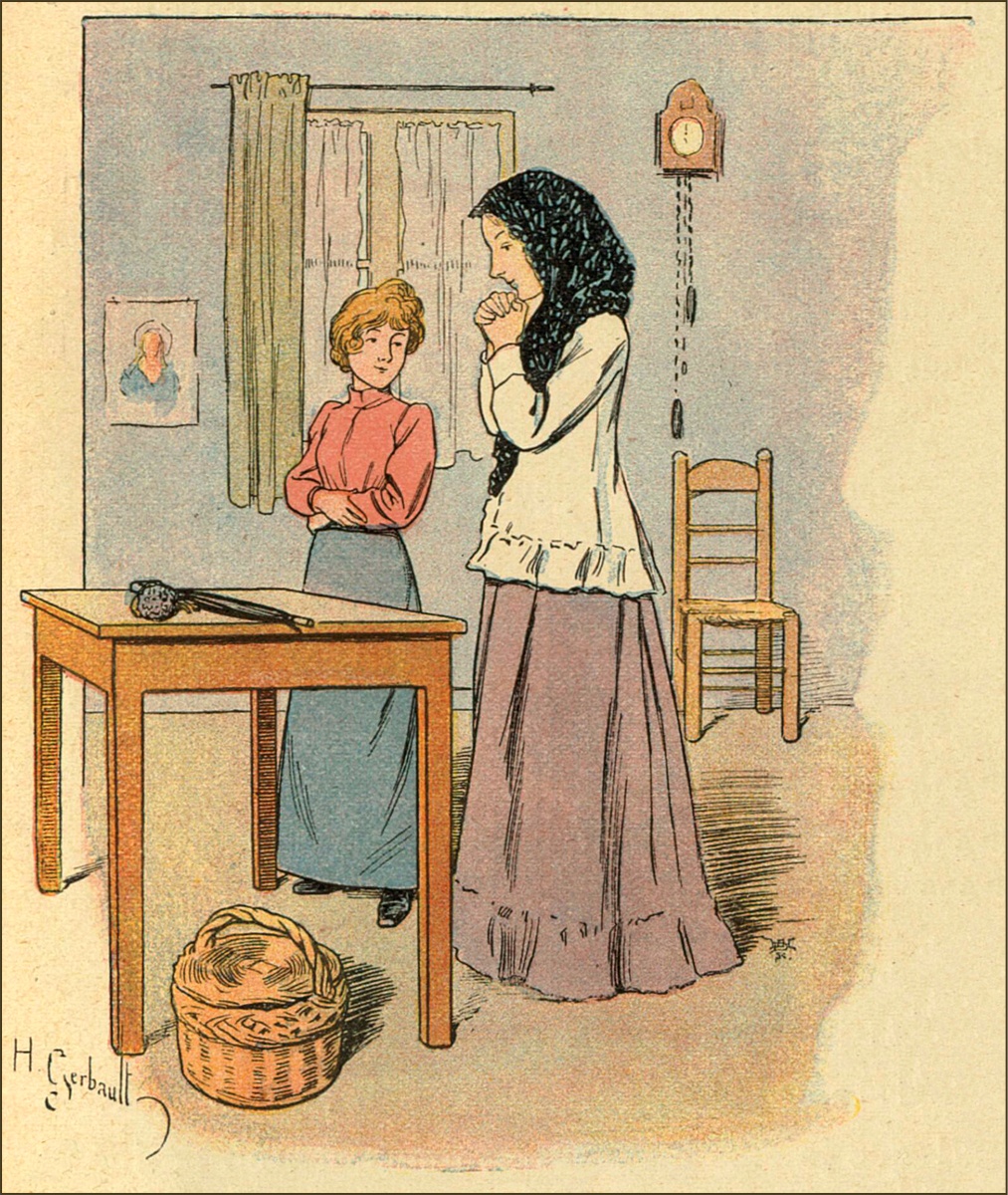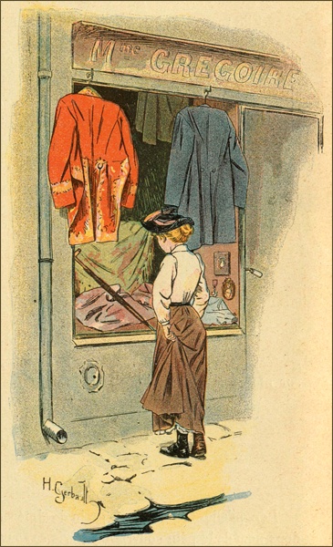 Un jour, comme Mme Rossignol était occupée dans son arrière-boutique, je vis entrer dans le magasin une dame et une petite fille d’une douzaine d’années, et, tandis que la sonnette retentissante de la porte prévenait la marchande, les deux étrangères échangeaient le dialogue suivant:
